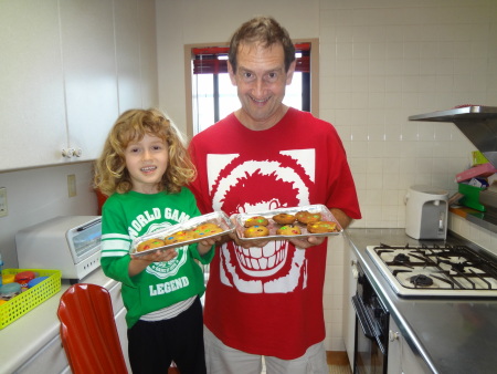 アメリカの クッキー作り ジュリアンの幼稚園のバザーに出す手作りのクッキーを、ロブと、ジュリアンは作りました。トッピングは、M&Mのチョコレートでした。 |