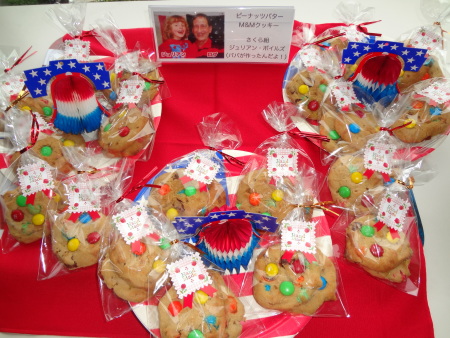 幼稚園の バザー 幼稚園のバザーに、手作りのピーナッツバターM&Mのクッキーを出品致しました。ロブは、10回の思考作品を繰り返しました。その結果、すごくおいしいクッキーができました。 |
