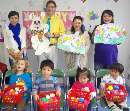 イースター パーティー 2才から3才の親子クラスです。親子クラスの生徒様もパーティーに参加しました。 ベックスでは、アメリカから買ってきましたイースターの卵が沢山ありますので、卵狩りのゲームと、卵ころがしのゲームを致しました。とても楽しかったです。 |